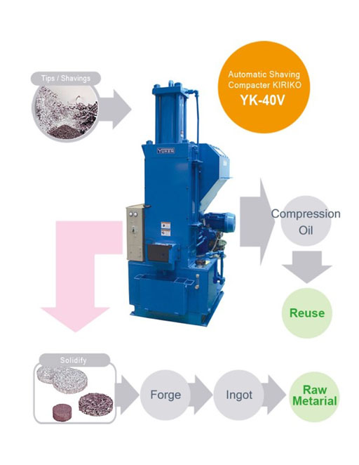 Scraps and shavings are compressed and solidified to up to 1/40th of their original volume by hydraulic power; optimal for environmental conservation and recycling by this machine.